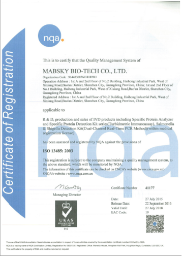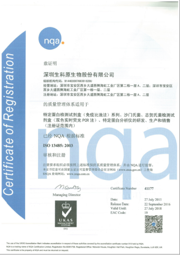 我公司2015年7月通過NQA上海的審核,取得ISO13485:CE認(rèn)證。繼公司2016年完成股份改制和CFDA等注冊(cè)變更,近日重新取得企業(yè)更名的ISO13485:CE新證書。